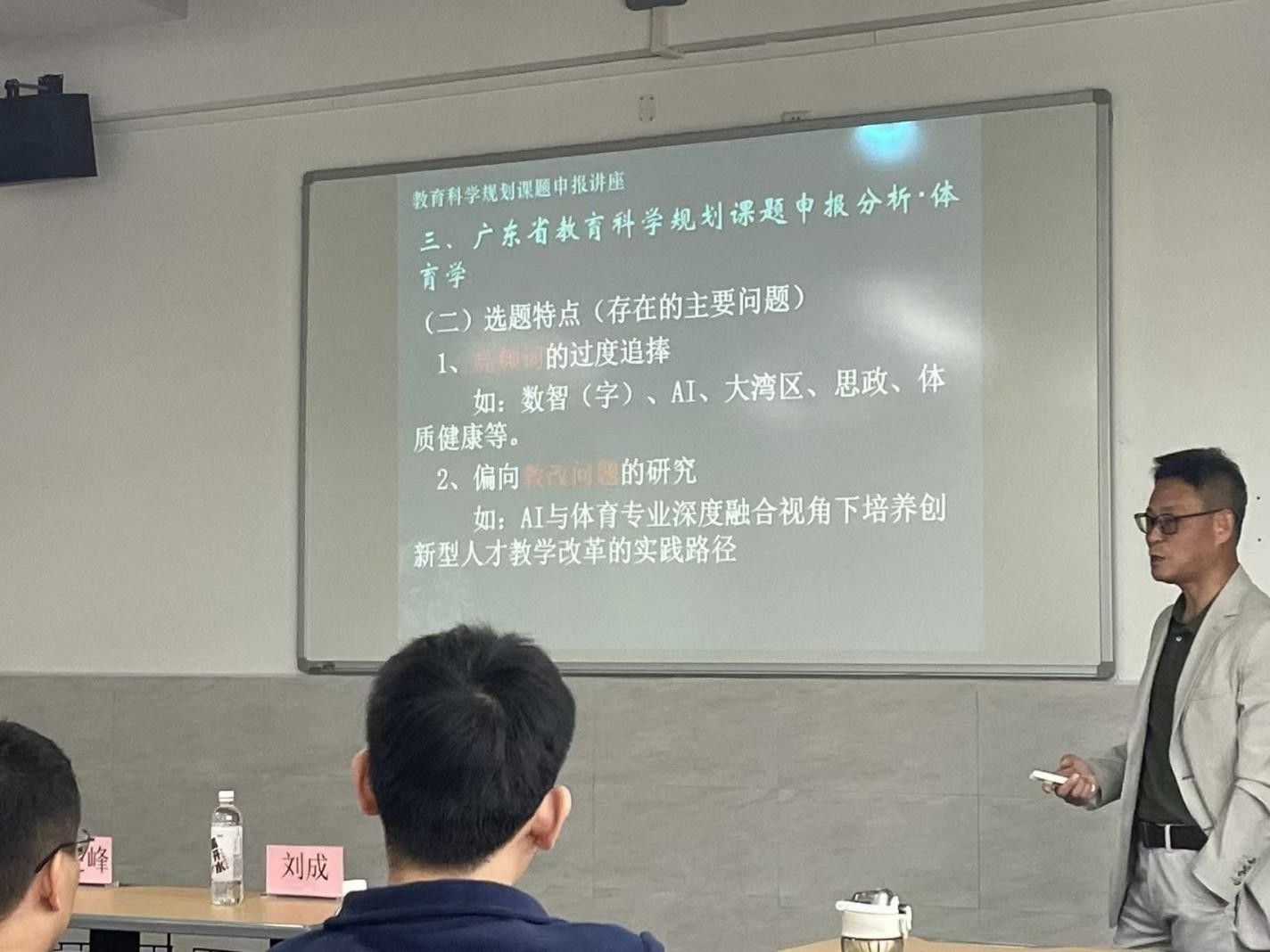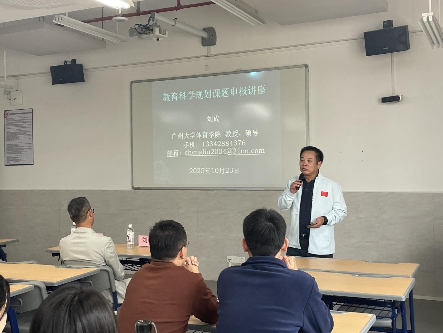 2025年10月23日下午,应学院院长邀请,广州大学体育学院教授、硕导刘成在学院会议室为全体教师带来一场题为“教育科学规划课题申报”的专题讲座。本次讲座旨在提升教师科研申报能力,推动学院教育科学研究水平再上新台阶。