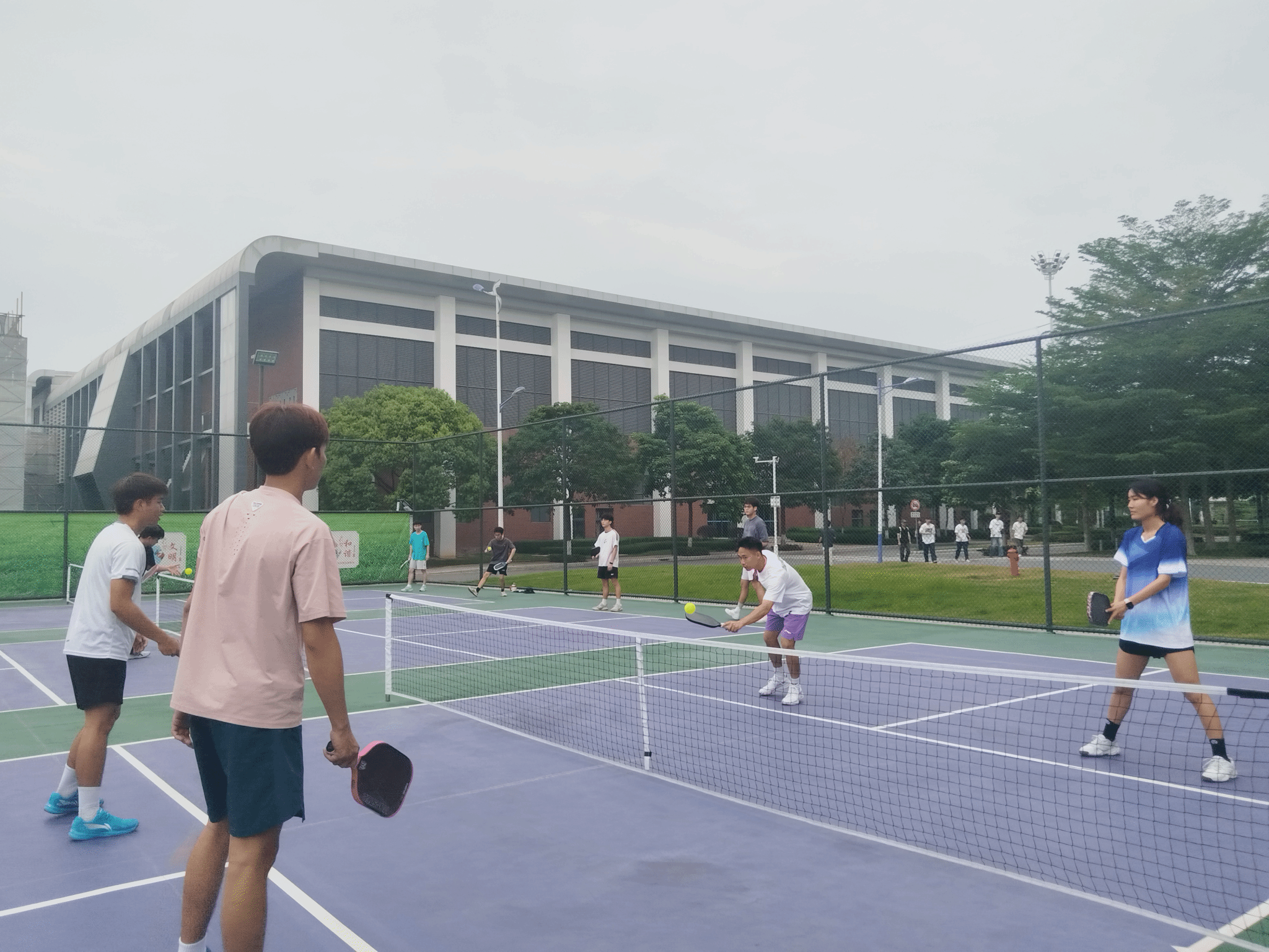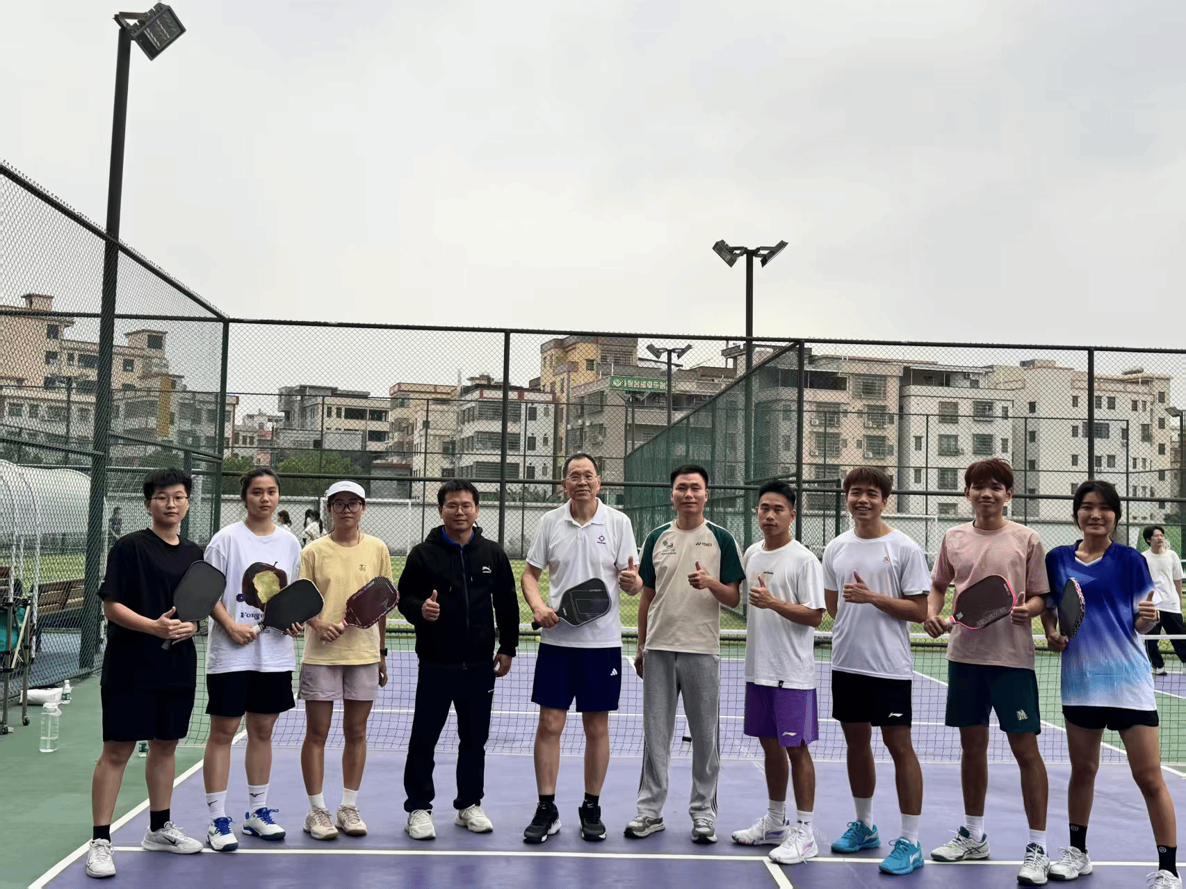 座谈结束后,欧俊杰总监、郭柏禧主管与我校匹克球队员进行了一场别开生面的交流赛。双方你来我往,以球会友,既展现了竞技风采,又增进了彼此情谊。期间,部分对羽毛球教练岗位感兴趣的同学也来到球场,与欧总监就后续实习安排进行了面对面交流。