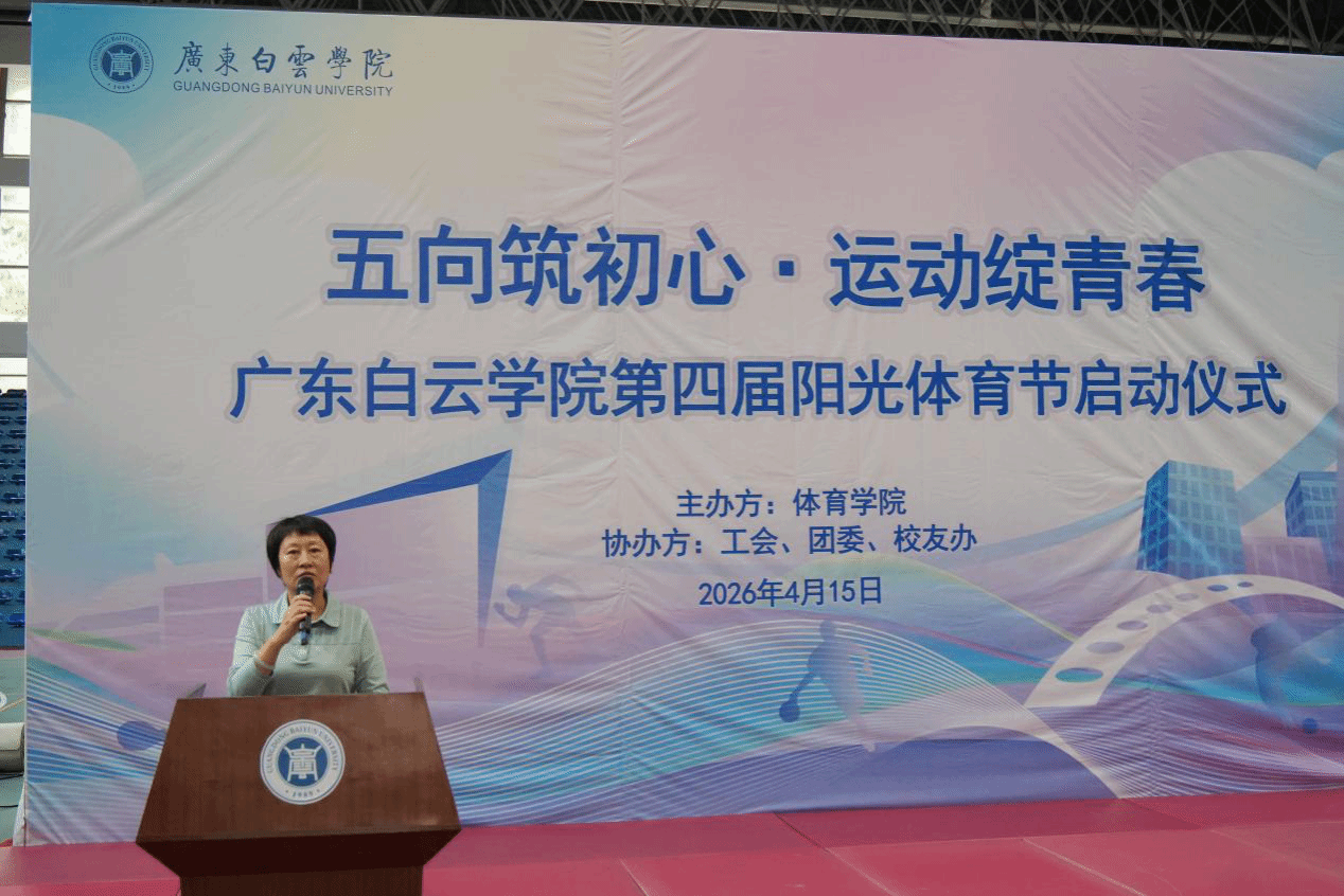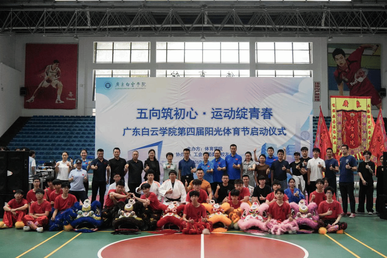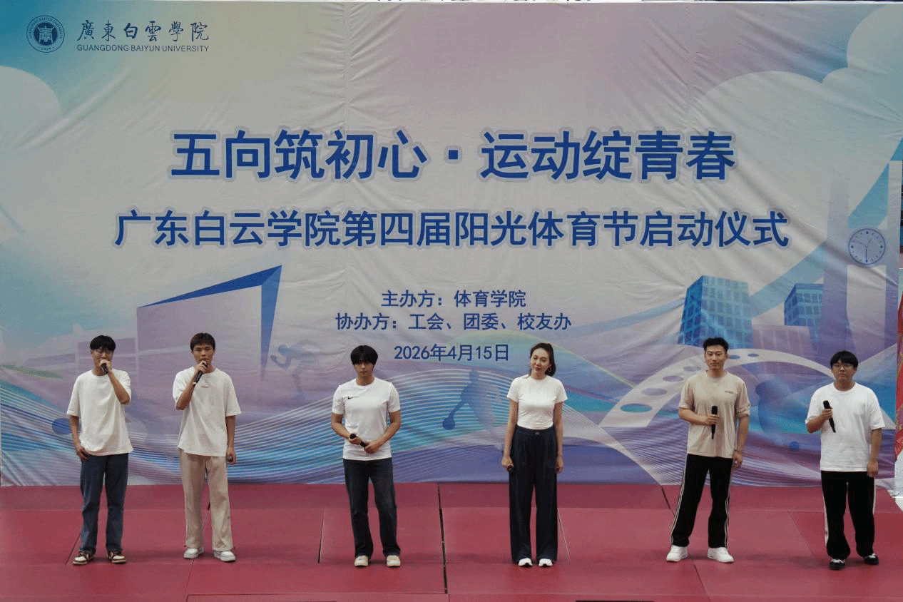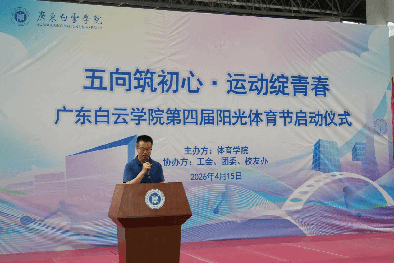 为深入贯彻习近平总书记在全国教育大会上的重要讲话精神,积极响应国家全民健身战略号召,引导广大师生在体育运动中“享受乐趣、增强体质、健全人格、锤炼意志”,培养德智体美劳全面发展的时代新人,4月15日下午,广东白云学院第四届阳光体育节开幕式在西校区体育馆隆重举行。本届体育节以“五向筑初心・运动绽青春”为主题,由体育学院主办,校团委、校友办、工会联合支持协办,副校长纪秋颖、校长助理柳贵东出席开幕式,各二级学院党委(党总支)书记、团委书记、校友代表及师生代表共同见证这一热血时刻。
