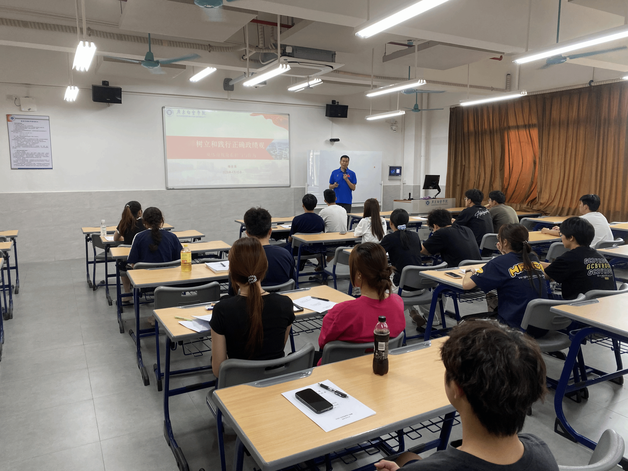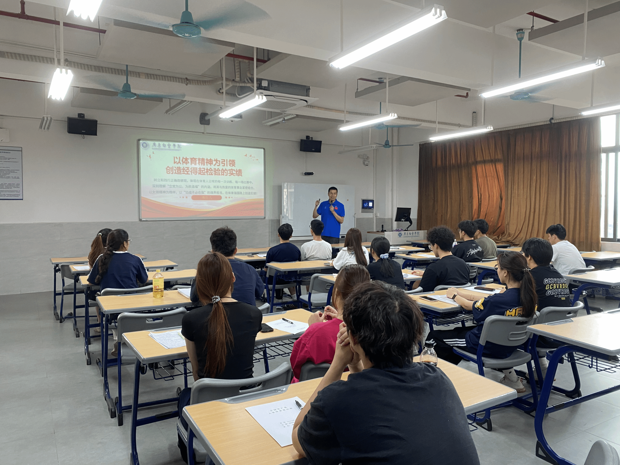 授课过程中,梅俊强副书记结合正反案例展开剖析。他以黄石市打造 15 分钟健身圈、郎平深耕女排梯队建设等正面实践为例,讲述了体育人如何以民生为导向、以长远为目标创造实绩;同时也以 “唯金牌论”“形象工程” 等反面案例为警示,提醒同学们摒弃短期功利思想,拒绝形式主义,把个人发展融入集体与国家事业。他鼓励同学们以女排精神为引领,学习蔡斌等体育前辈 “功成不必在我、功成必定有我” 的担当,在专业学习与训练中脚踏实地,锤炼过硬本领。