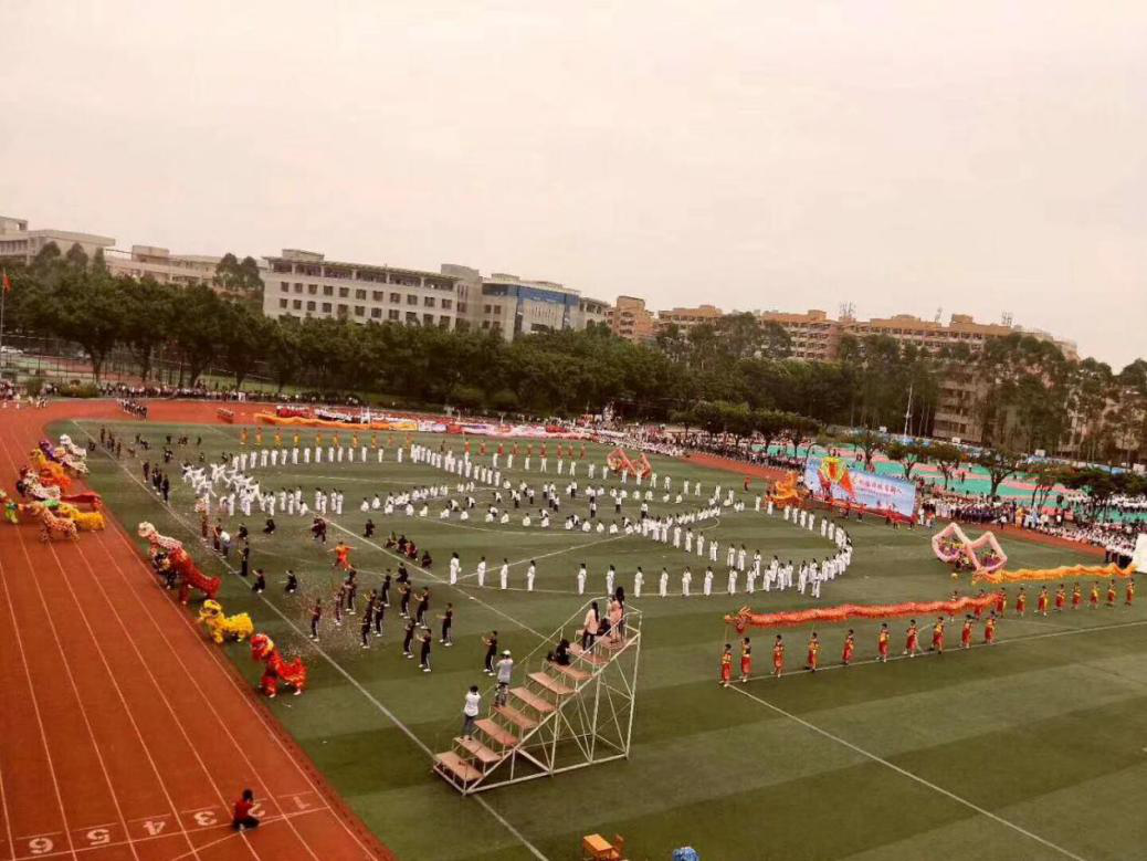 图为广东白云学院2017年校运会开幕式。开幕式由多个节目组成,我校龙狮团为此精心准备了龙朋狮友的表演,为我校师生表演助兴,为运动员们喝彩