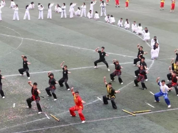 上图是武术套路队伍校运会开幕式表演后的合照。武术套路队带来的的拳法是:长拳。姿势舒展大方,动作灵活快速,出手长,跳得高,蹦得远,刚柔相济,快慢相间,动迅静定,节奏分明