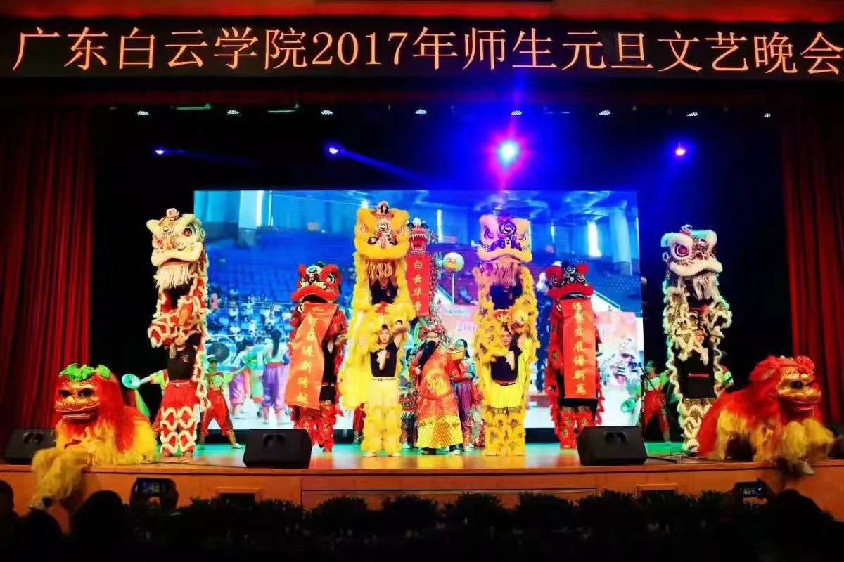 图为广东白云学院2017年元旦文艺晚会开幕,龙狮团表演热场