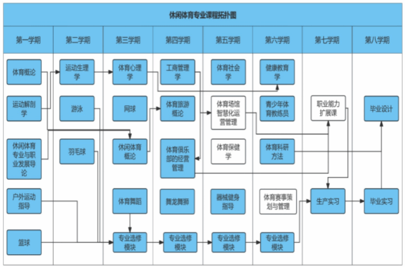 休闲体育概论、体育旅游概论、体育俱乐部的经营管理、游泳、器械健身、网球、舞龙舞狮、篮球、羽毛球、体育舞蹈、户外运动、青少年体育教练员。